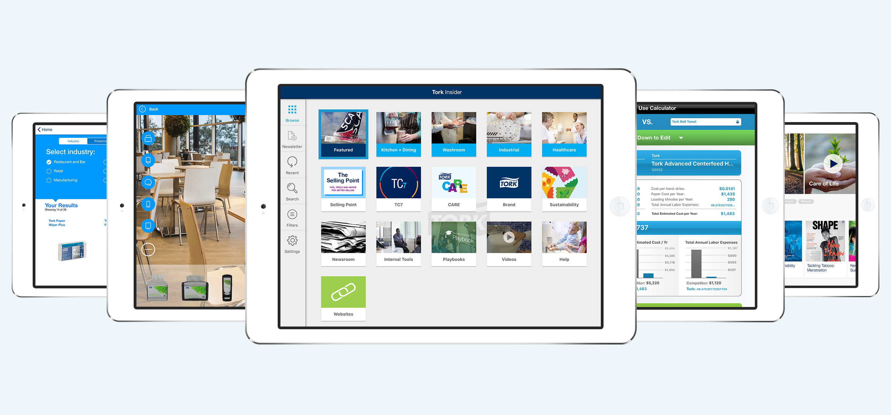 After identifying the key decision moments along the funnel, we knew that a suite of apps were required – one for each of those seven key moments. All a sales rep had to do was open the right app for the right customer and deliver the focused messaging needed at that time to help keep them moving. Like the Tork Insider which allows reps to select from a library of up-to-date sell-sheets, presentation decks, news, images and videos to custom-tailor presentations for each potential customer. Or Tork Snapshot which allows customers to take pictures of their spaces and place Tork products in them to visualize how they might look.